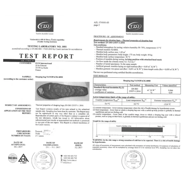Éprouvé selon la norme EN ISO 23537-1, le Nanopak annonce des valeurs fiables : 5 °C (confort), 0 °C (limite) et −15 °C (extrême). Ces références garantissent une gestion sereine des écarts de température du printemps à l’automne. Pour plus de maîtrise, une petite fermeture au niveau des pieds assure une ventilation ciblée lors des nuits plus clémentes.